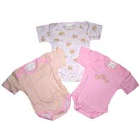 Squeak, great basic bodysuits. 2 with little mice and the 3rd with stripes. 100% cotton.