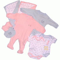 Gorgeous luxury 4 piece set presented in a satin edged tulle hanging cover. Suitable for 0-6 months.
